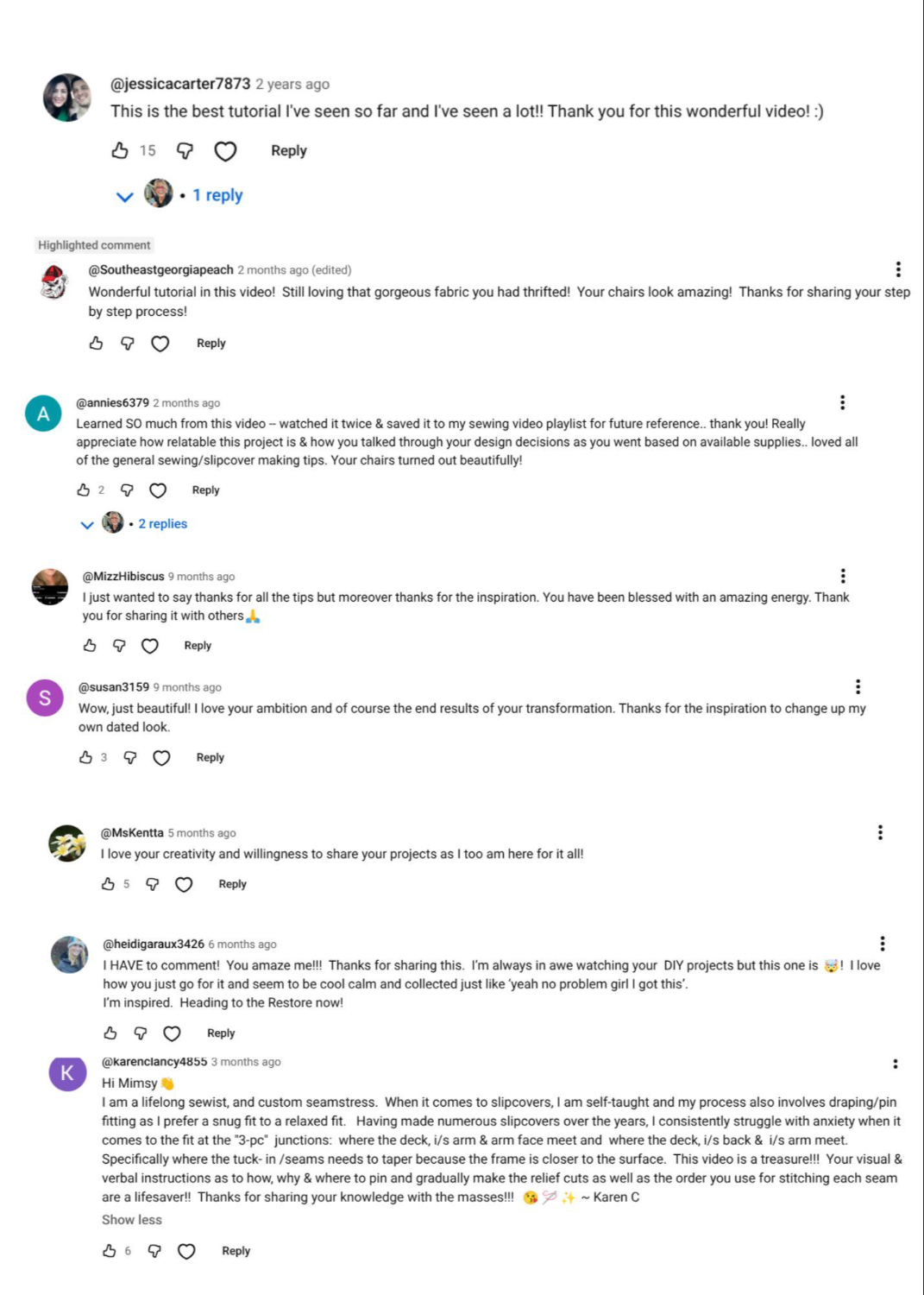 These are actual YouTube comments from people who’ve learned upholstery skills through Mimzy’s free videos. Before launching this course, she taught thousands through free tutorials. Here's what they had to say.